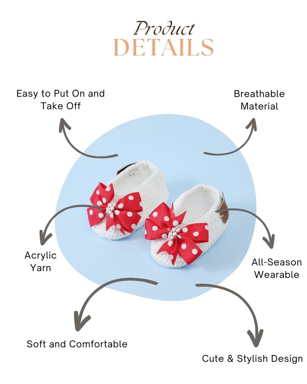These handmade crochet baby booties in white and red are designed to keep your baby girl stylish and comfortable. Made with soft acrylic wool, these baby booties are suitable for infants aged 6-12 months and ideal for all seasons. The vibrant red accents on the classic white design create a striking look, making these booties for baby girls perfect for any occasion. Lightweight, breathable, and easy to wear, these baby booties provide comfort and protection for your little one’s delicate feet while adding a splash of color to any outfit.