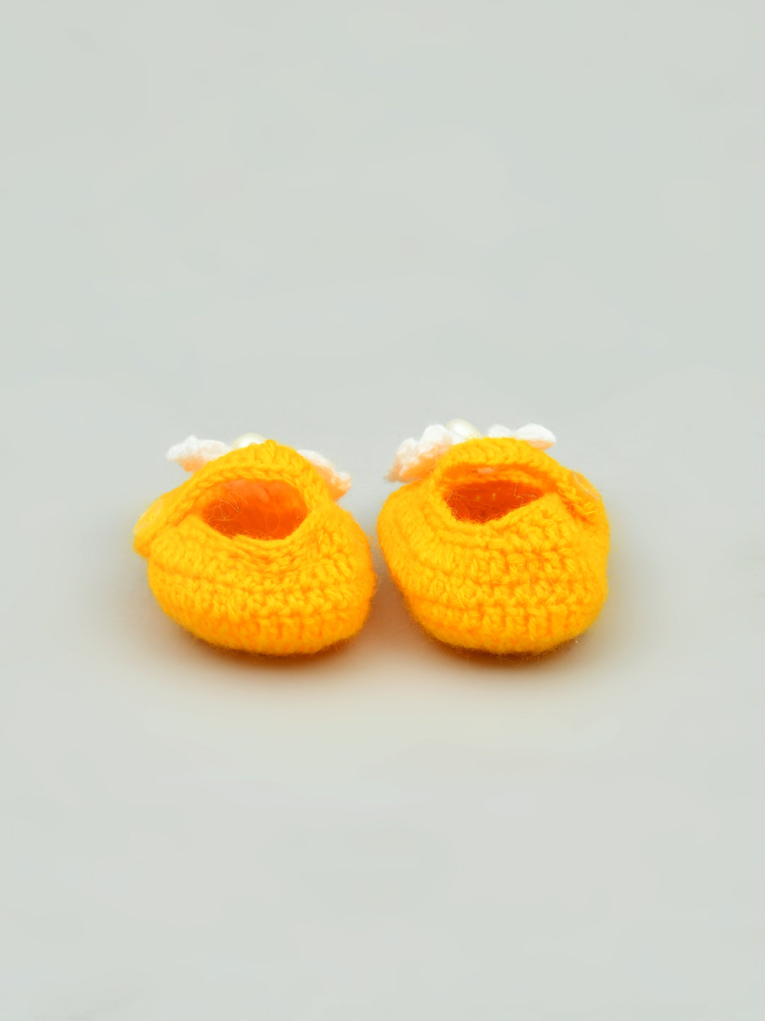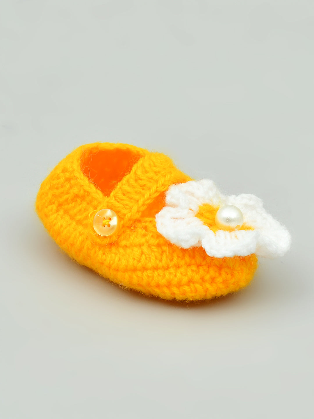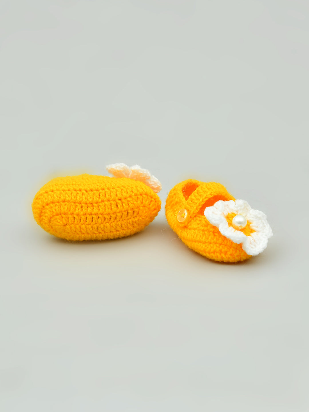 Dress up your baby in the cutest way with these yellow & white flowered crochet baby booties for girls from Funkrafts. Handcrafted from high-quality wool.