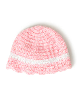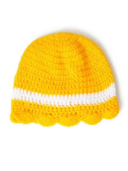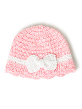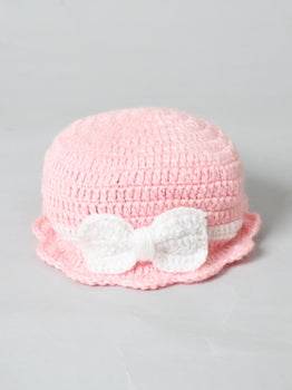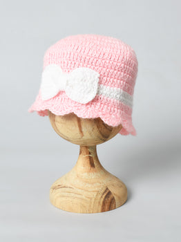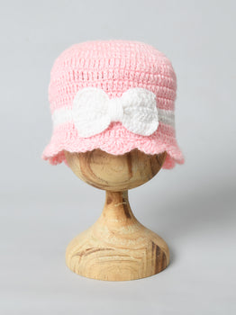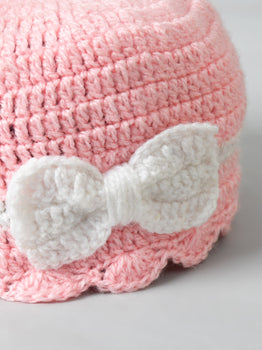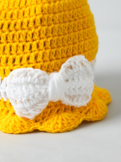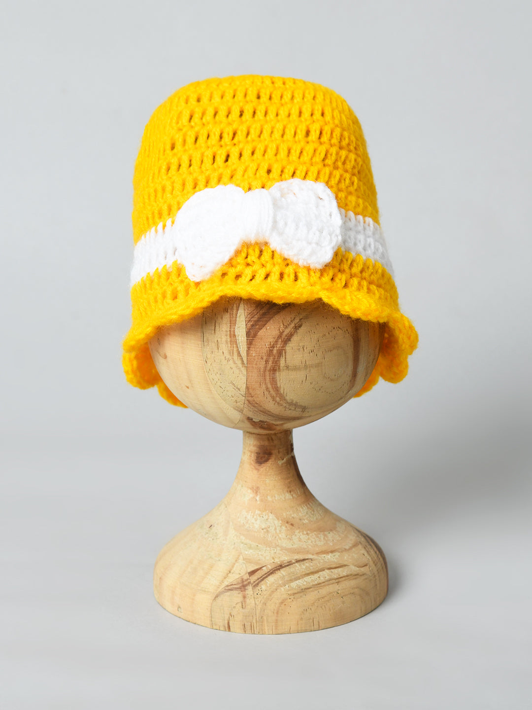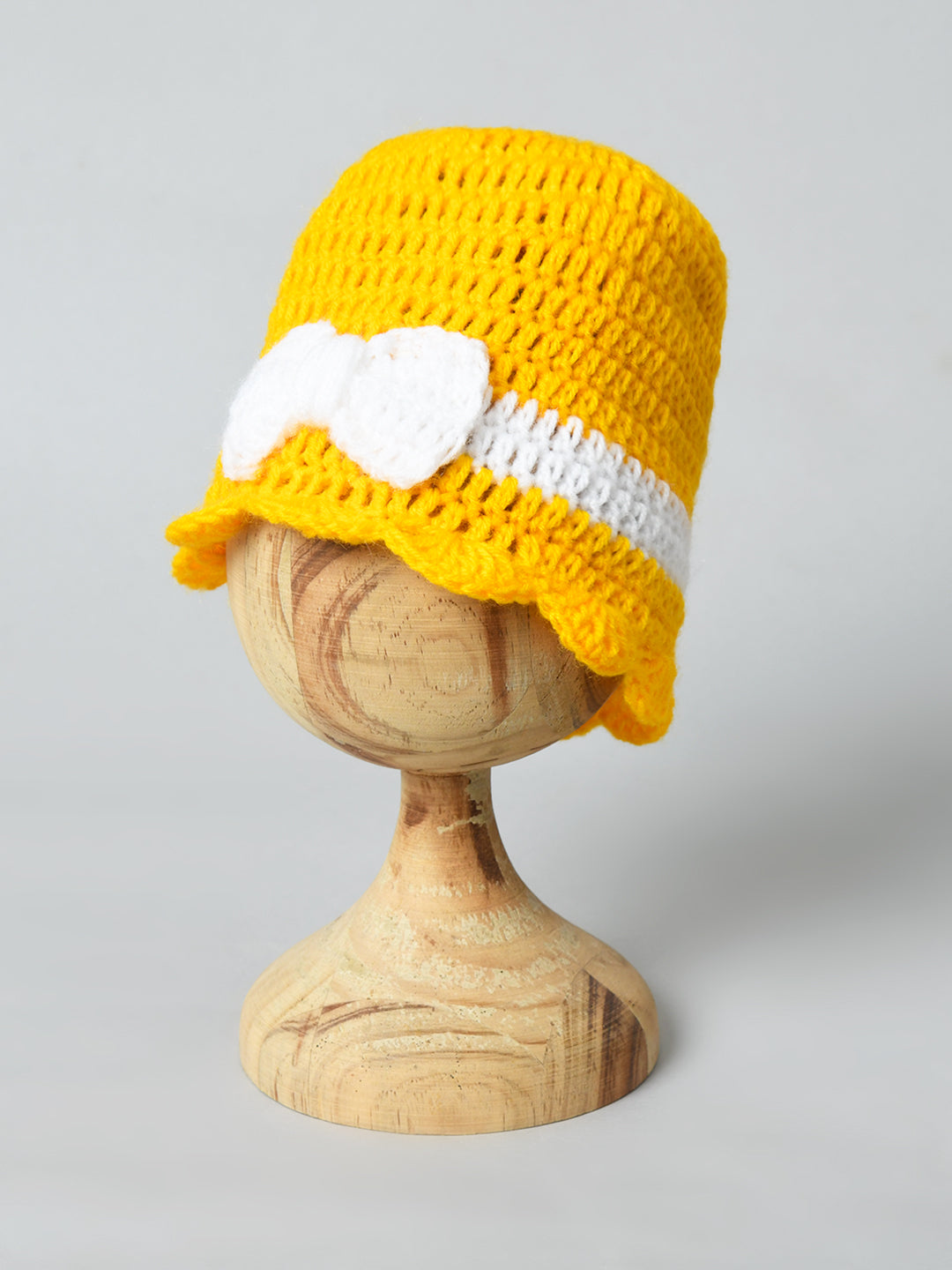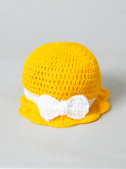 Yellow & White Handmade Woollen Cap with Bow for Girls